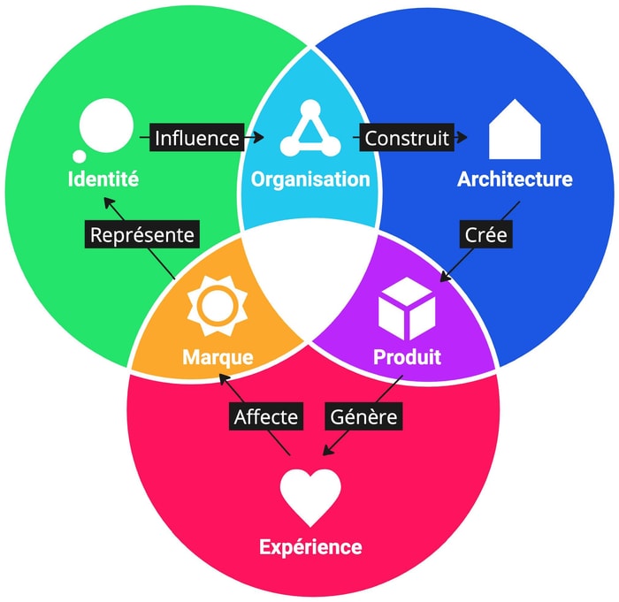 Ces trois facettes créent trois intersections tout aussi importantes : Organisation (entre Identité et Architecture), Produit (entre Architecture et Expérience) et Marque (entre Expérience et Identité). Ce modèle visuel permet de voir comment une décision dans un domaine affecte les autres. Par exemple, l'ajout d'un système d'IA conversationnelle modifie l'expérience client, influence la marque, nécessite des ajustements organisationnels et doit s'intégrer aux processus existants.