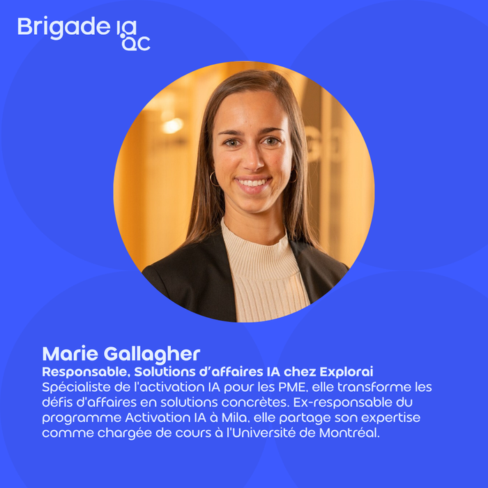 Expert en stratégies d'IA depuis 25 ans, il a codirigé la stratégie québécoise d'IA et copiloté la création de l'OBVIA. Chez IVADO, il mobilise l'écosystème pour accélérer l'adoption responsable de l'intelligence artificielle.Marie Gallagher, Responsable, Solutions d'affaires IA, Explorai